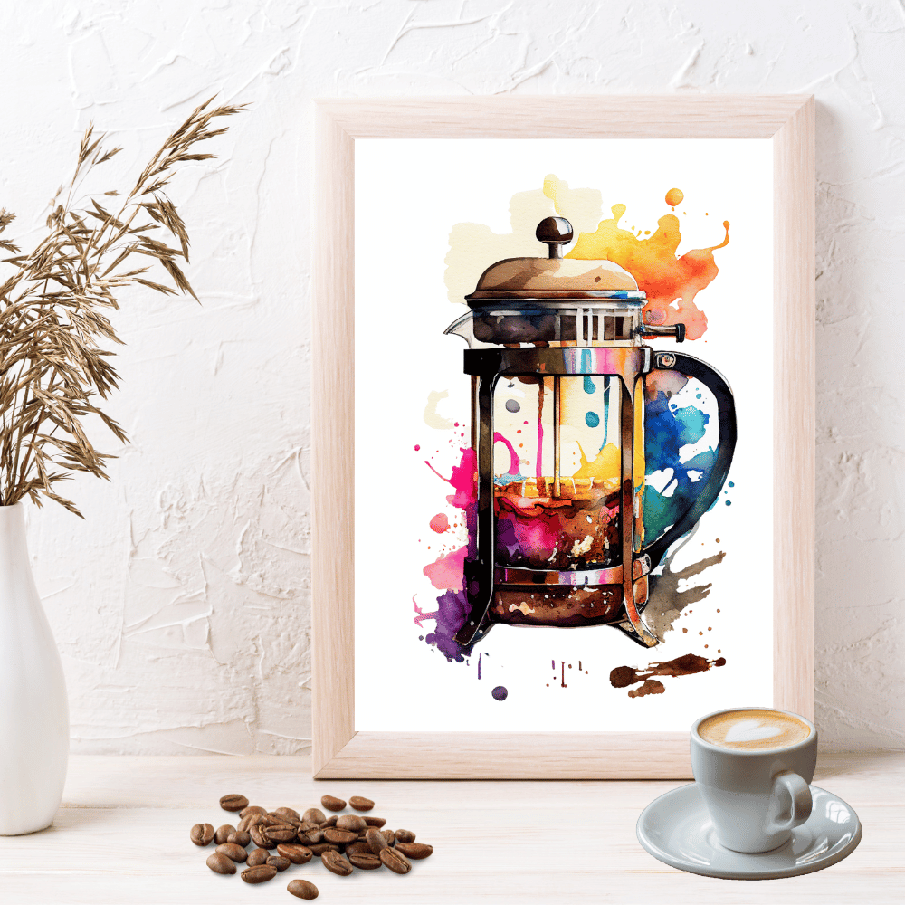 Ah, můj oblíbený způsob přípravy kávy – French Press! Tento plakát vypadá jako slavnostní průvod různých barev a šmoulů, co se setkali na jednom místě, aby oslavili kávu. French Press je uprostřed, hrdě stojící jako zlatý kalich na oltáři, ze kterého se valí vůně kávy. A co je to za šmoulu, co se na něm prohání? Zdá se, že to je kávová šmoula, která plave na hladině a užívá si chuť a vůni kávy. A co tam dál je? To jsou barevné kruhy, které symbolizují různé chutě a vůně kávy. Jsou to jako halo kolem svatého Grálu kávy, French Pressu.