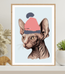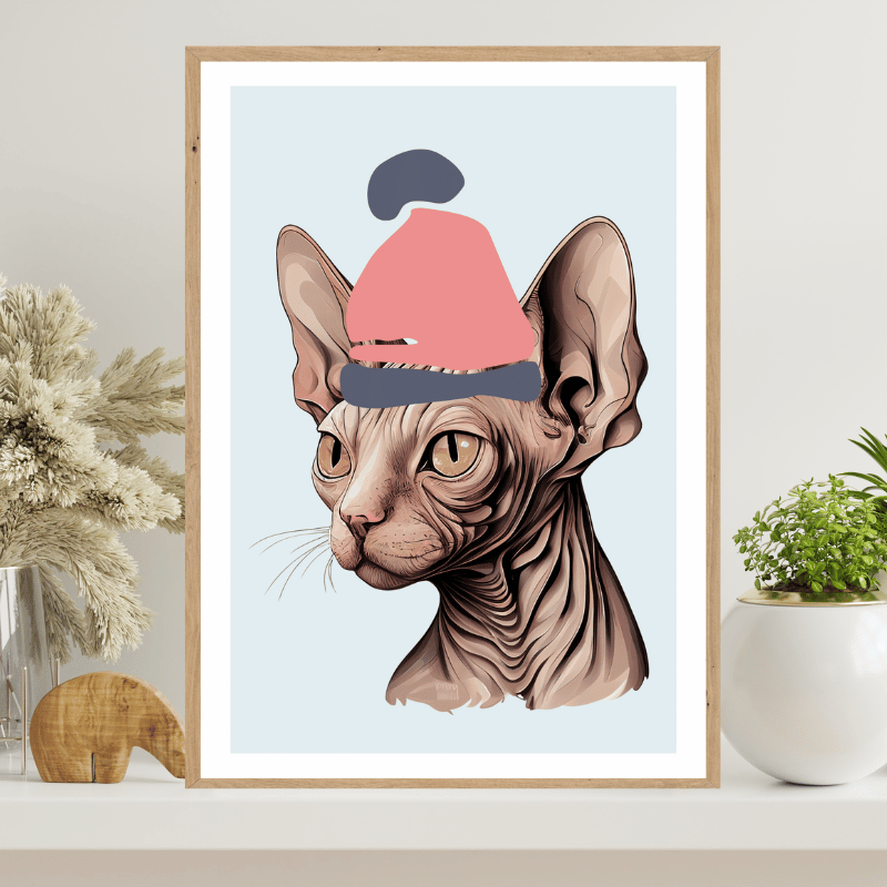 Hledáš něco, co ti vylepší stěny a přitáhne pohledy návštěvníků? Tak to se ti asi zachtělo něco originálního, a co by bylo originálnějšího, než portrét bezsrsté kočky Sphynx s růžovým kulichem na hlavě? Ano, slyšel jsi správně! Tento plakát vám přinese nejen krásu, ale také dávku humoru.