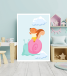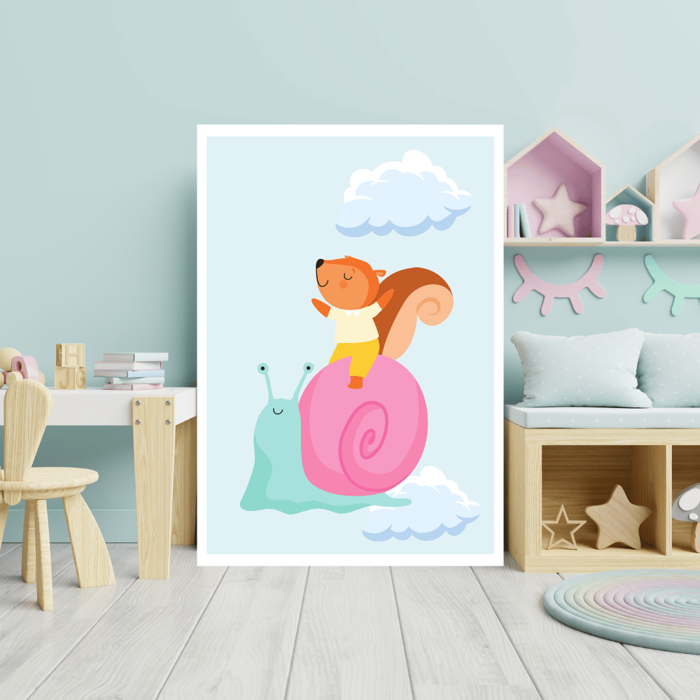A to není všechno! Veverka, která sedí na šneku, má ruce rozpažené a zavřené oči, což znamená, že se jí to musí líbit! Šnek musí být velmi hladký a pohodlný pro let. Jsem si jist, že když se děti podívají na tento plakát, tak se budou chtít také na šneka posadit a letět spolu s veverkou.