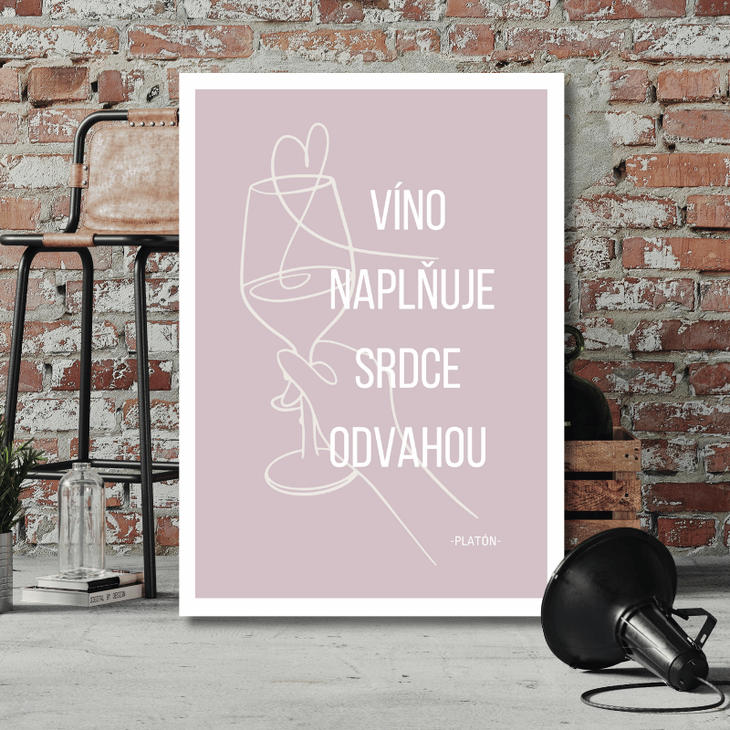 Tento plakát je jako záznam jednoho dokonalého okamžiku – ruka se vztyčuje k nebi s tou nejlepší sklenkou vína v ruce, a srdce se naplňuje odvahou. Platón by určitě souhlasil – víno dokáže povznést ducha i mysl a dát nám odvahu čelit všem výzvám života. A co víc, když máte kousek vína v ruce, nikdy nejste sami!